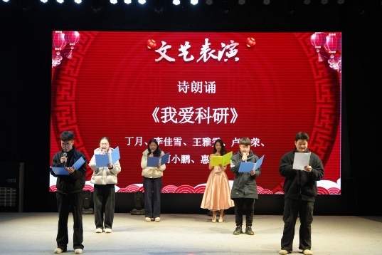 李建军教授与靳紫恒副研究员携手演唱歌曲《只要有你》,歌声中蕴含温暖力量;硕士生刘思润展示了原创歌曲《小屋下》传递了室友间的温情,丁月、李佳雪、卢世荣、何小鹏、惠政豪与课题组同学一同朗诵《我爱科研》表达了对科研最纯真本源的情感,谢凌希、王彭菲以一曲《恭喜发财》引爆全场传递了美好的新年祝福。